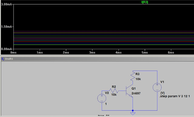 I applied 1 volt to the base through a 10K resistor. This sets the base current used in the test. I am stepping the collector from 3 to 12 volts in 1 volt steps. As you can see the collector current is very close to steady state.( we'll look at the reason for the small change later.)