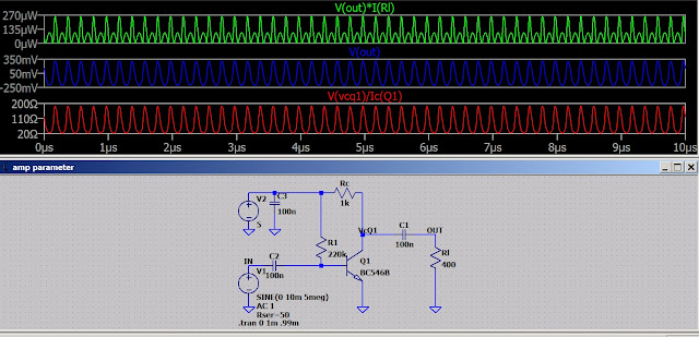 | I set Rl = Rc / 10 and raised Ic to 10ma. More power out. Note Rl is about 1/10 Rc. Look at RQ1. So it is becoming more obvious that for voltage gain we want a high Z circuit and for power gain we want a lower Z circuit. |